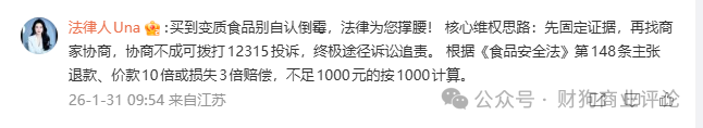 网友法律人Una表示:买到变质食品别自认倒霉,法律为您撑腰! 核心维权思路:先固定证据,再找商家协商,协商不成可拨打12315投诉,终极途径诉讼追责。 根据《食品安全法》第148条主张退款、价款10倍或损失3倍赔偿,不足1000元的按1000计算。